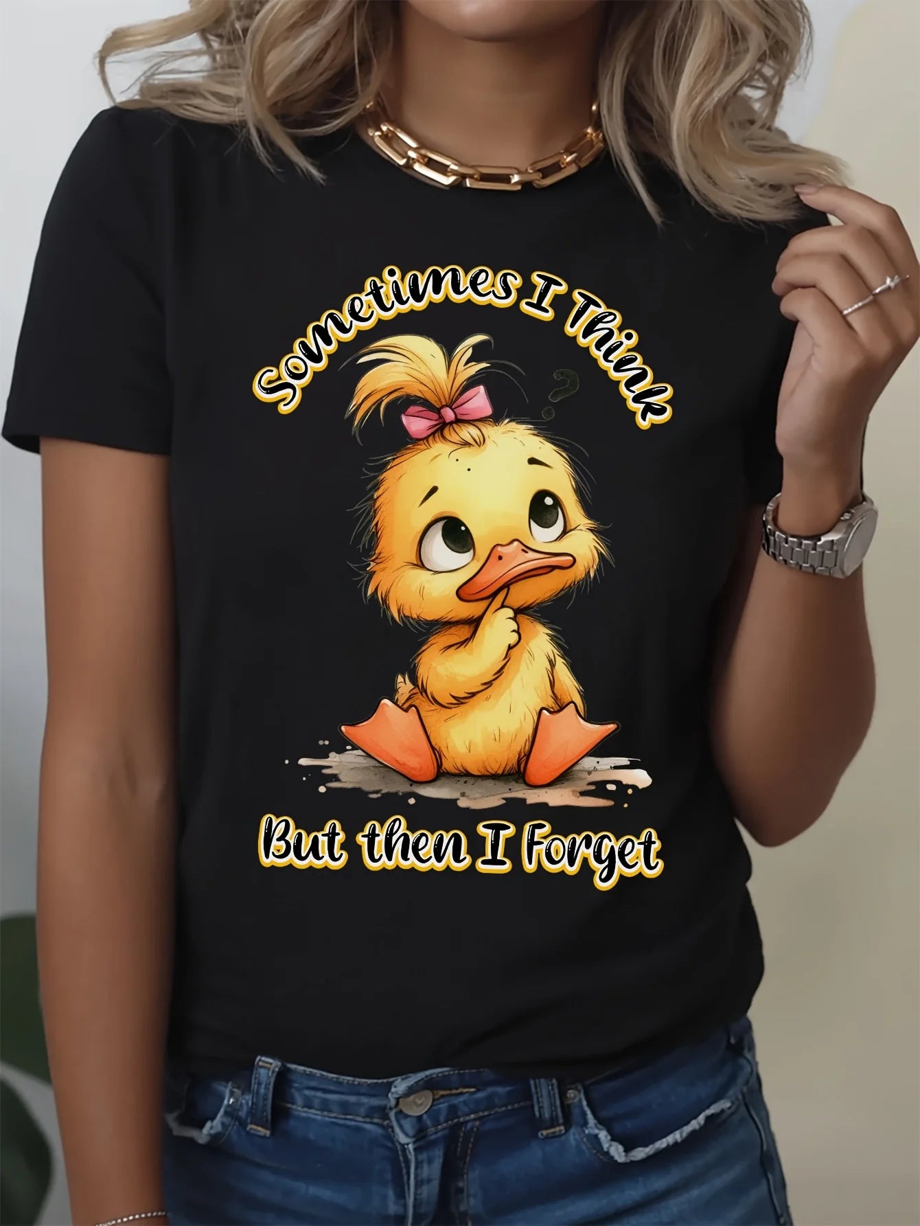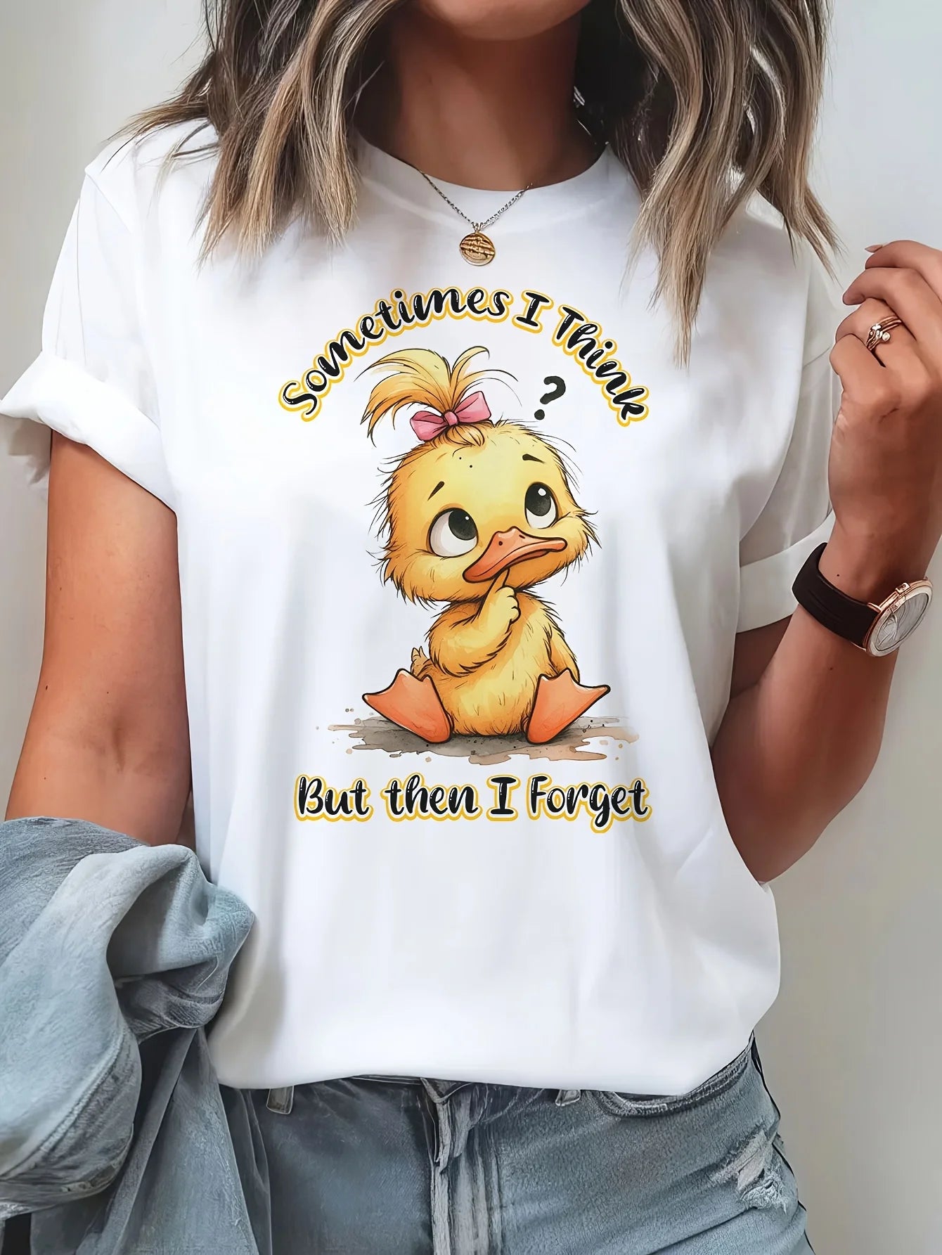 Duck for THINK Forget Women's Graphic T-Shirt - Cute Cartoon Duck with "Sometimes I for THINK Too Much But Then I Forget" Print