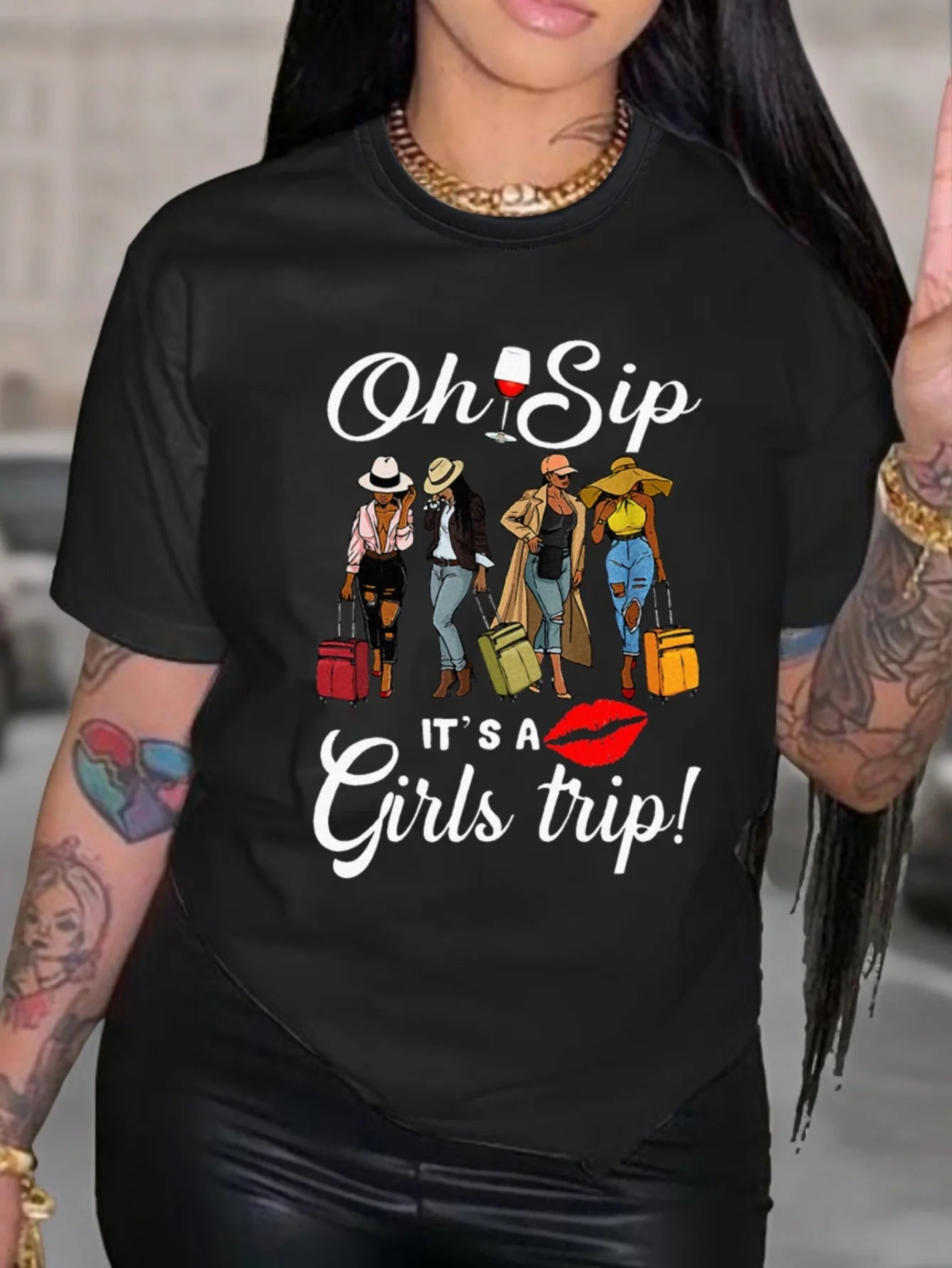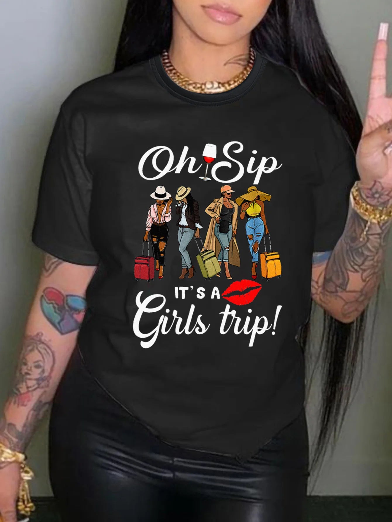Oh Sip! It's A s Trip Women's T-Shirt - Black Casual Short Sleeve Round Neck Tee with Cartoon Travel Graphi